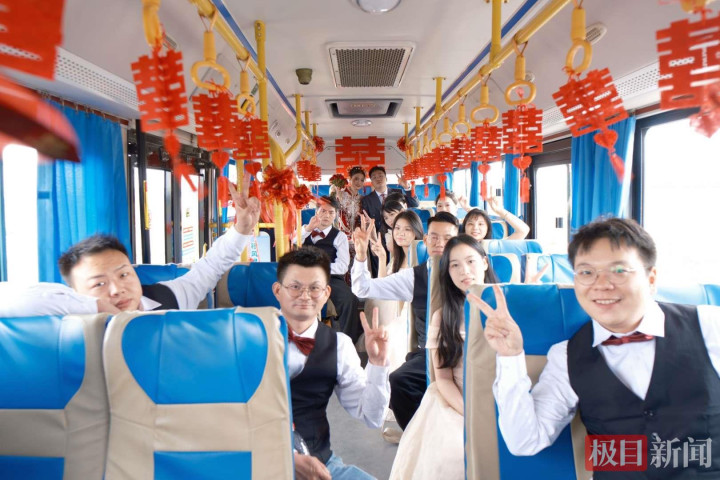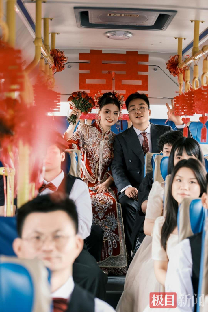 “公交车空间大,可以容纳20多人,我们一行人包括我和妻子、伴郎伴娘以及摄影师坐上后,车内依然十分宽敞。”曹宇浩说,他和朋友提前一天到公交公司对婚车进行了精心装扮,车内挂满了喜字,车头则装饰了大红花球,使得整辆公交车洋溢着喜庆的氛围。
